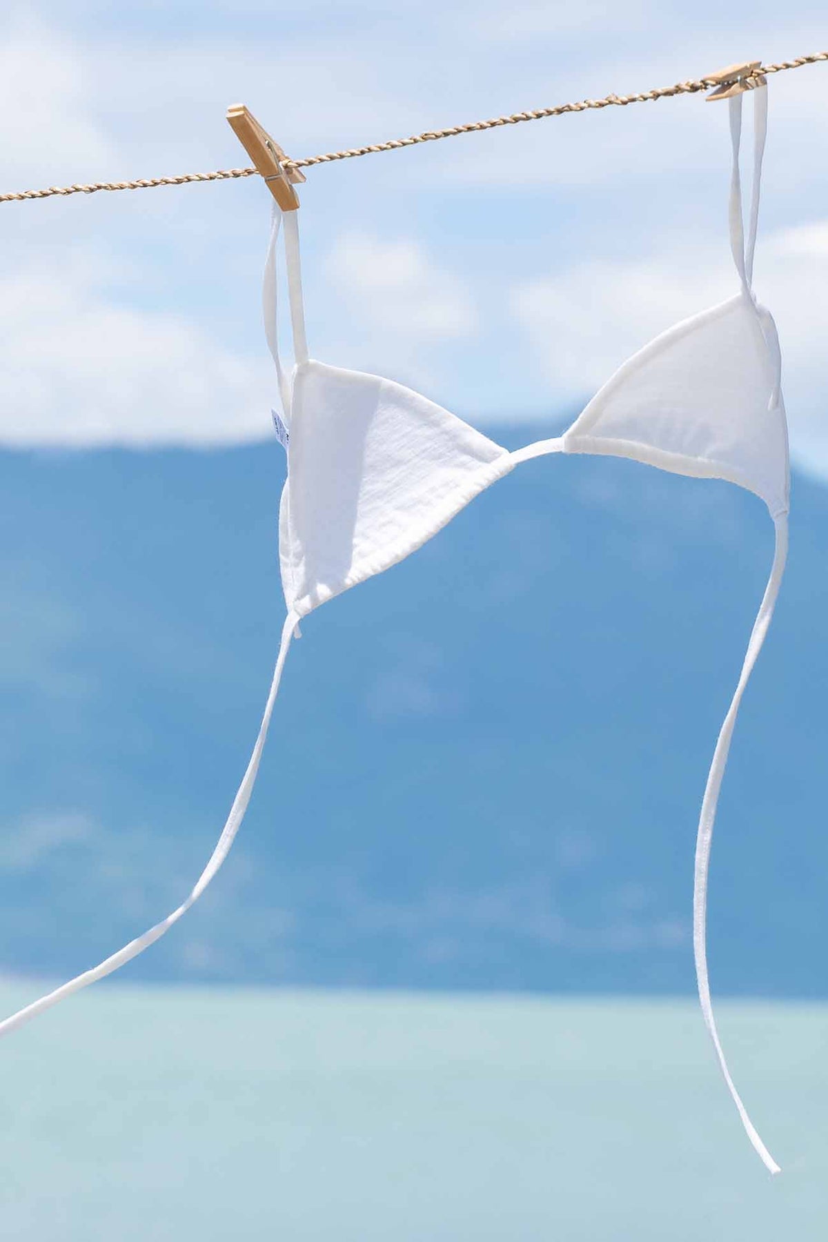 White sustainable triangle merino wool tie bikini top on a white background
